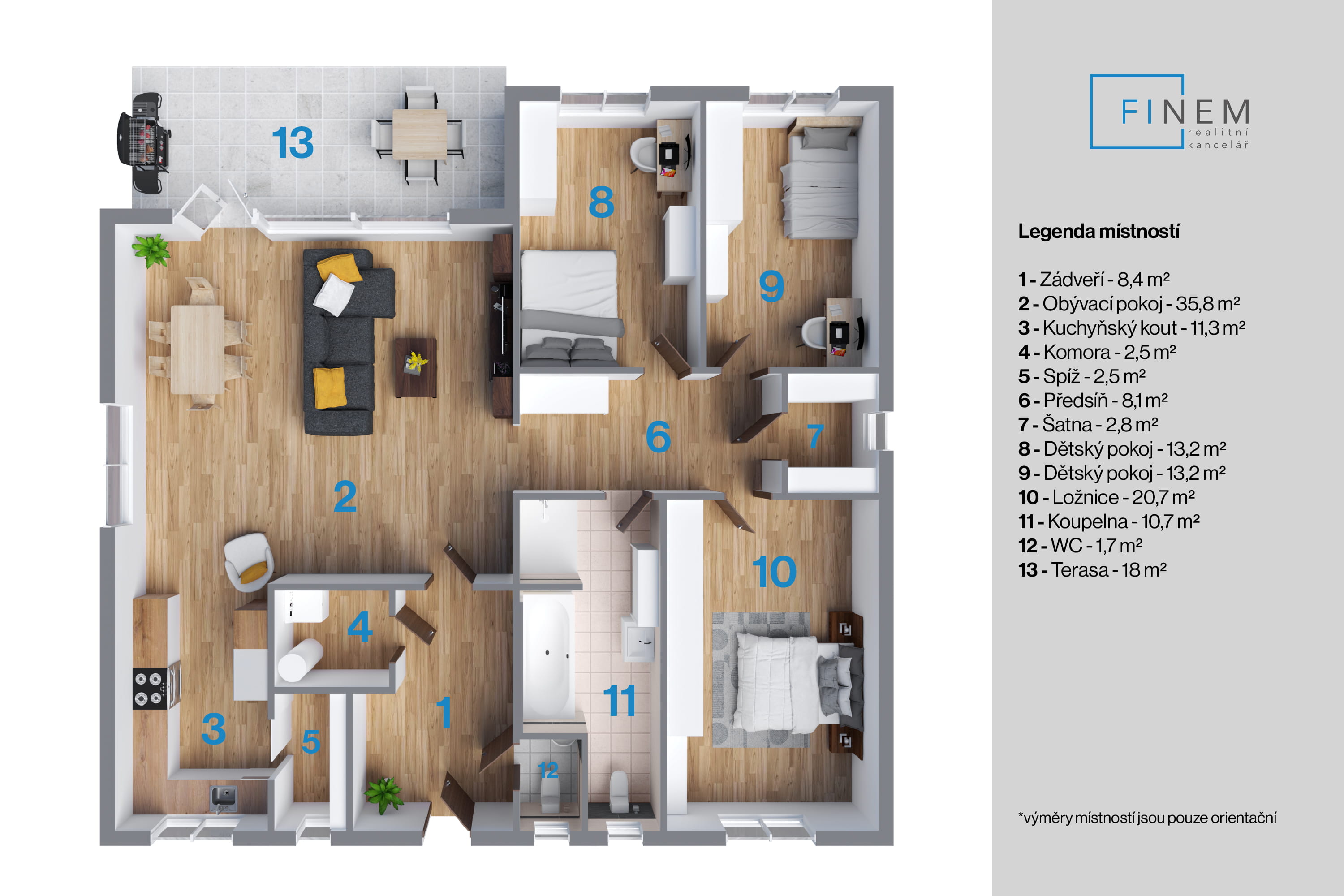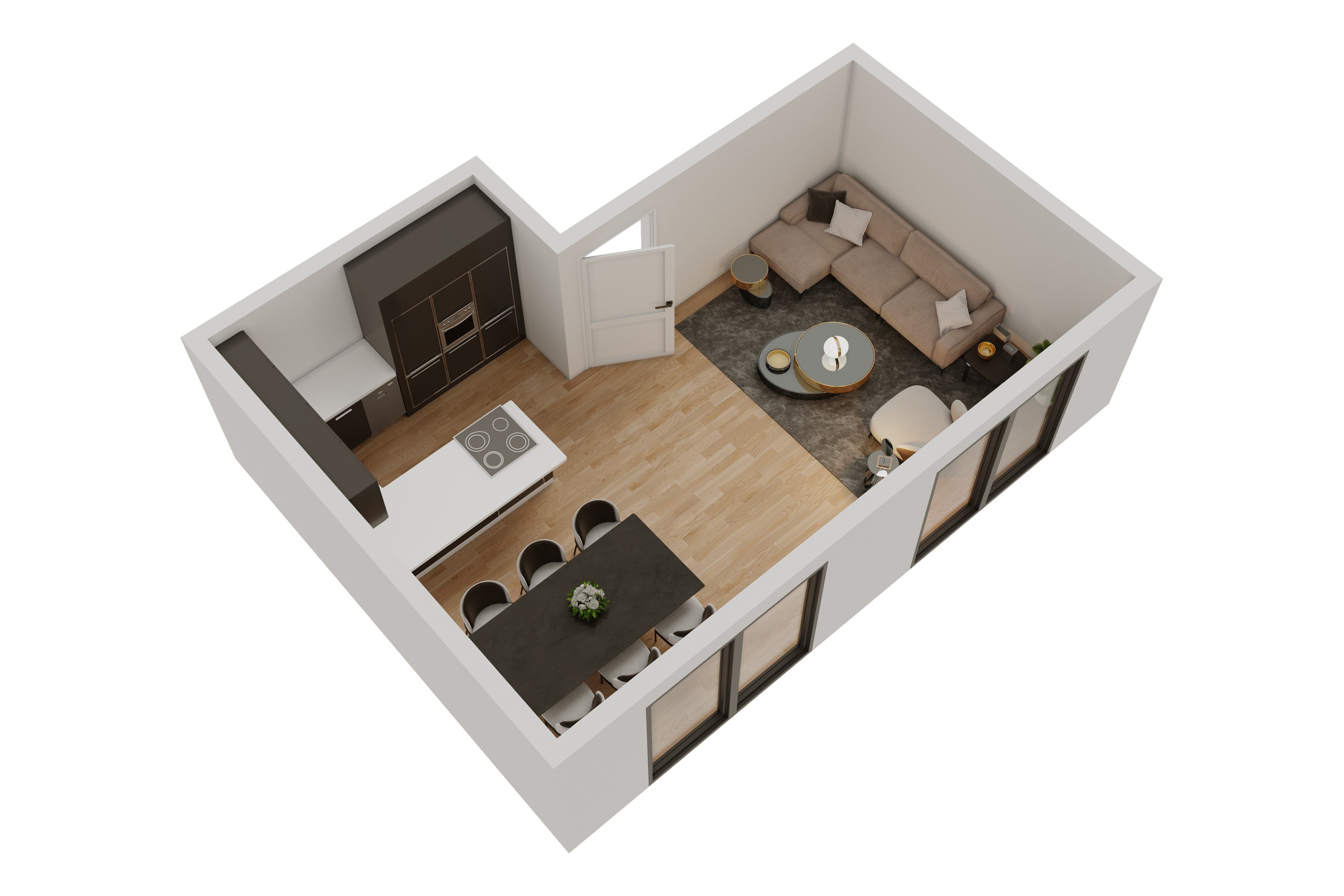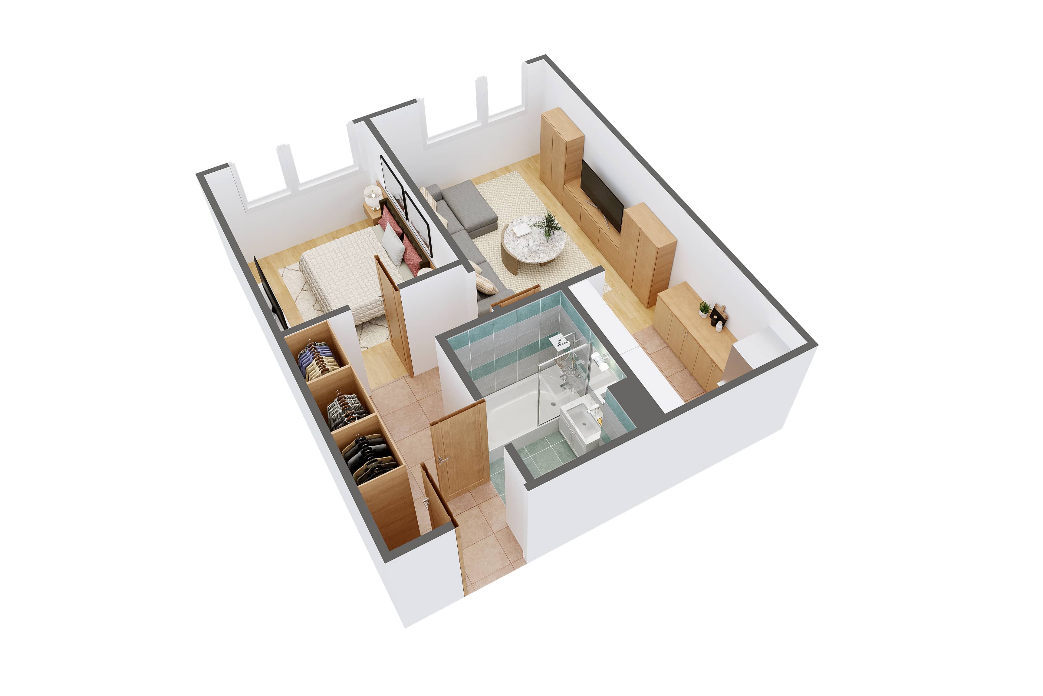 Tato propracovanější verze půdorysu je pro kupující mnohem zajímavější a atraktivnější. Kromě rozvržení pokojů ukazuje také možné zaplnění prostoru vybavením a nábytkem, což poskytuje lepší představu o finálním vzhledu interiéru.